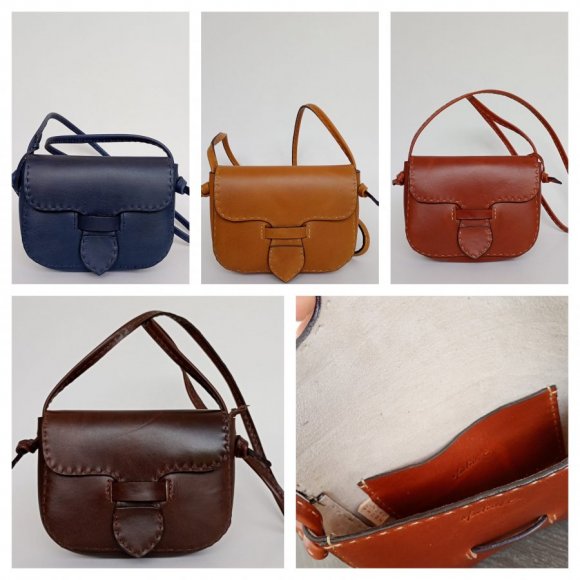 Alforja carriel redondo En cuero encerado Forro interior en gamuza de cuero. Bolsillo interior en cuero Dimensiones: 20 cm x 15 cm x 5 cm Cosido a mano.